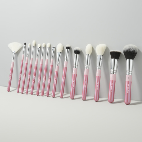 منتجات جديدة YM مجموعة فرش مكياج بشعار مخصص بلون وردي 15 طقم فرش مكياج من الألومنيوم أنبوب ظلال عيون اصطناعية